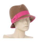 Włoski wełniany filcowy kapelusz damski jasny brązowy różowa taśma