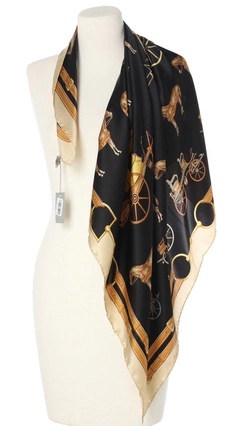Ekskluzywna czarna jedwabna apaszka chusta włoska Marina D'Este 90x90 Italian Silk karoce konie