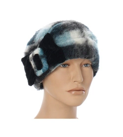 Włoska czapka damska. Ozdobiona dużą aksamitną kokardą. Polarowa podszewka. Modny wzór kraty. Produkcja włoska.