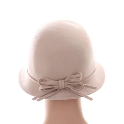 Oryginalny filcowy kapelusz. Fason: melonik. Z tyłu potrójna filcowa kokarda.