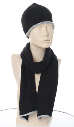 Czapka i szalik ozdobione małym kwiatuszkiem oraz wykończone kontrastowym lurexem...