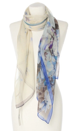 Włoski jedwabny duży szal do sukienki kremowy niebieski Laura Biagotti 65x175cm 100% szyfon jedwab silk seta Print