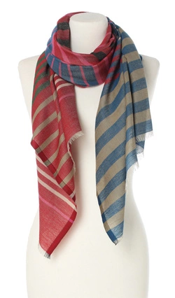 Wełniany lekki szal w paski Laura Verdiani 75x190cm 100% wełna denim czerwony Made in Italy