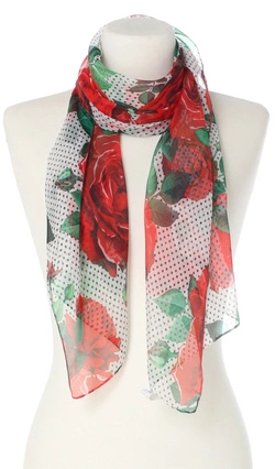 Włoski lekki szal szalik w groszki i czerwone róże chusta 45x160cm do koszuli i sukienki